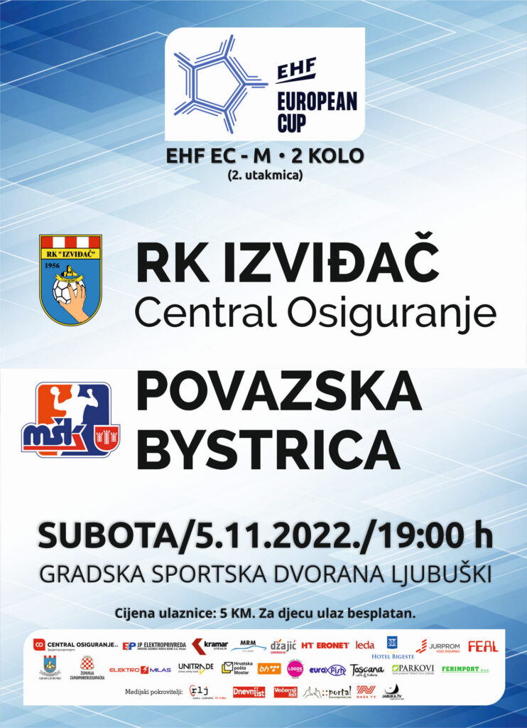 Utakmica između rukometaša Izviđač Central osiguranje i MŠK Povašzske Bystrice igra se u Gradskoj športskoj dvorani u Ljubuškom u subotu, 05.11.2022. godine s početkom u 19:00 sati.